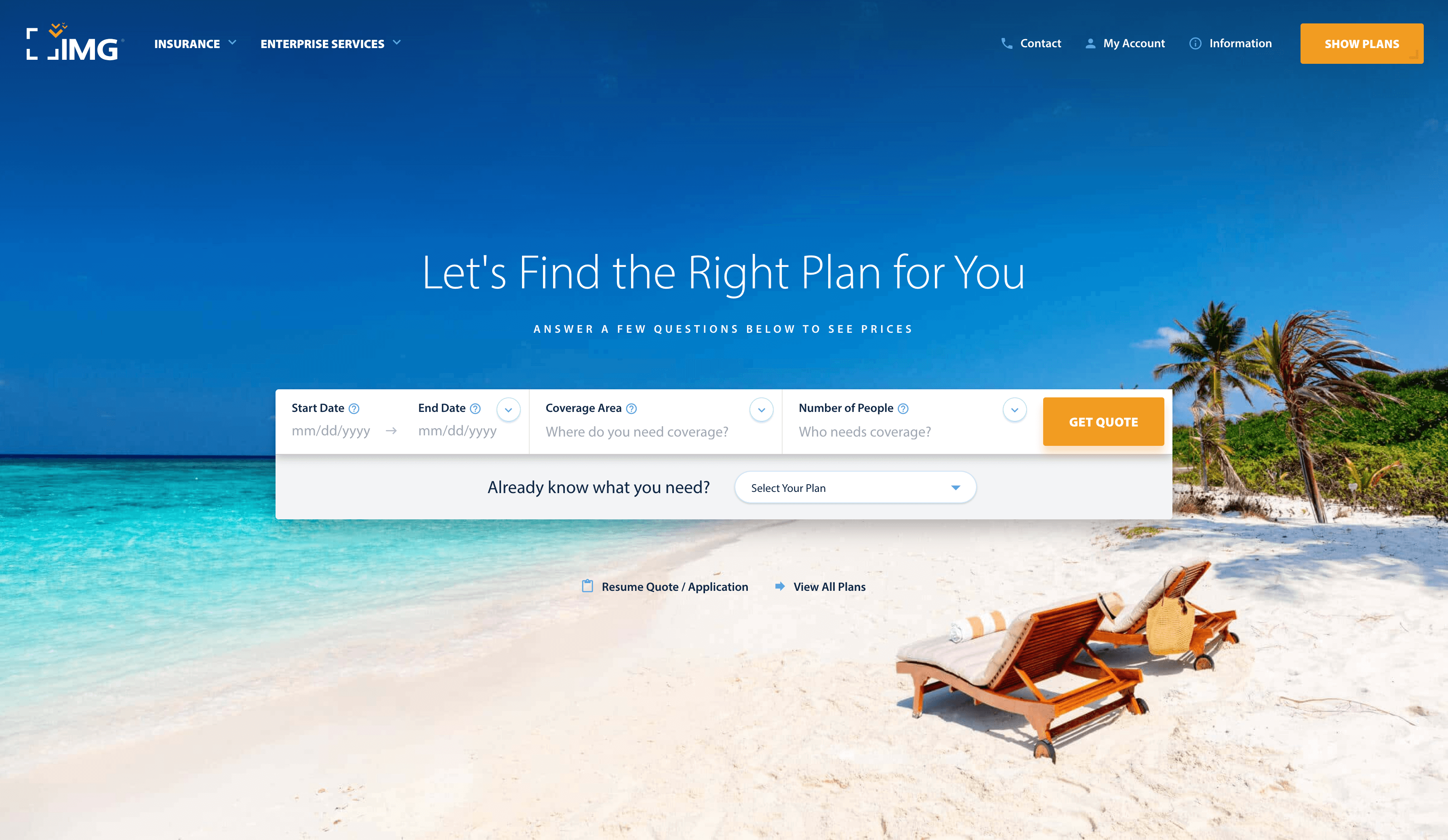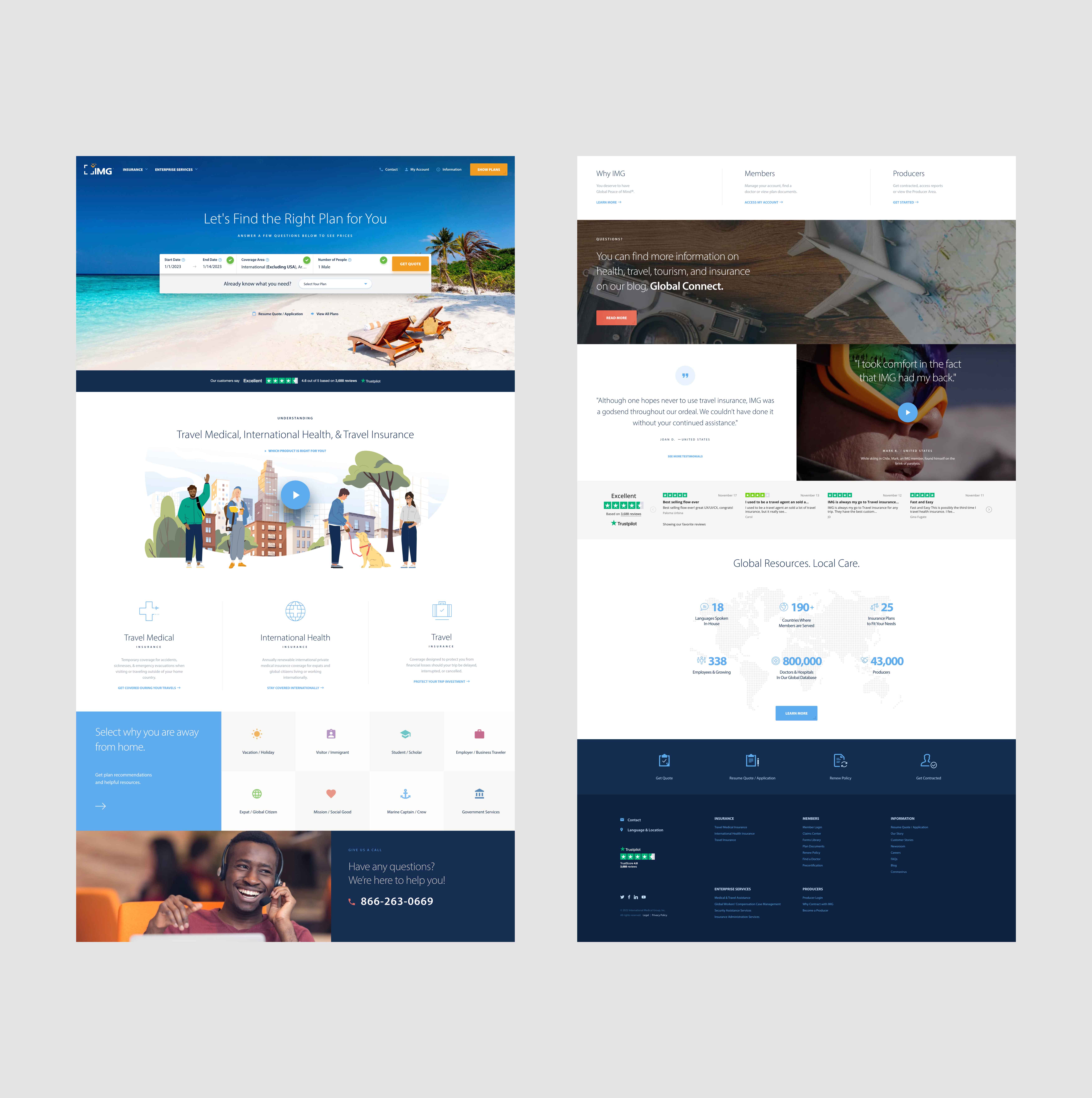 The homepage pre-quote asks the user a few questions to provide travel insurance quotes that best match the user's travel insurance needs. By asking relevant questions upfront, the pre-quote can gather necessary information and generate accurate insurance quotes tailored to the user's specific needs. This approach can help streamline the insurance selection process and enhance user satisfaction. The rest of the homepage is used to educate the user and why it is essential to ensure a trip. By providing relevant information, International Medical Group aims to create awareness among users and emphasize the need for insurance coverage when traveling. Educational content can help users make informed decisions and understand the value of the services provided.