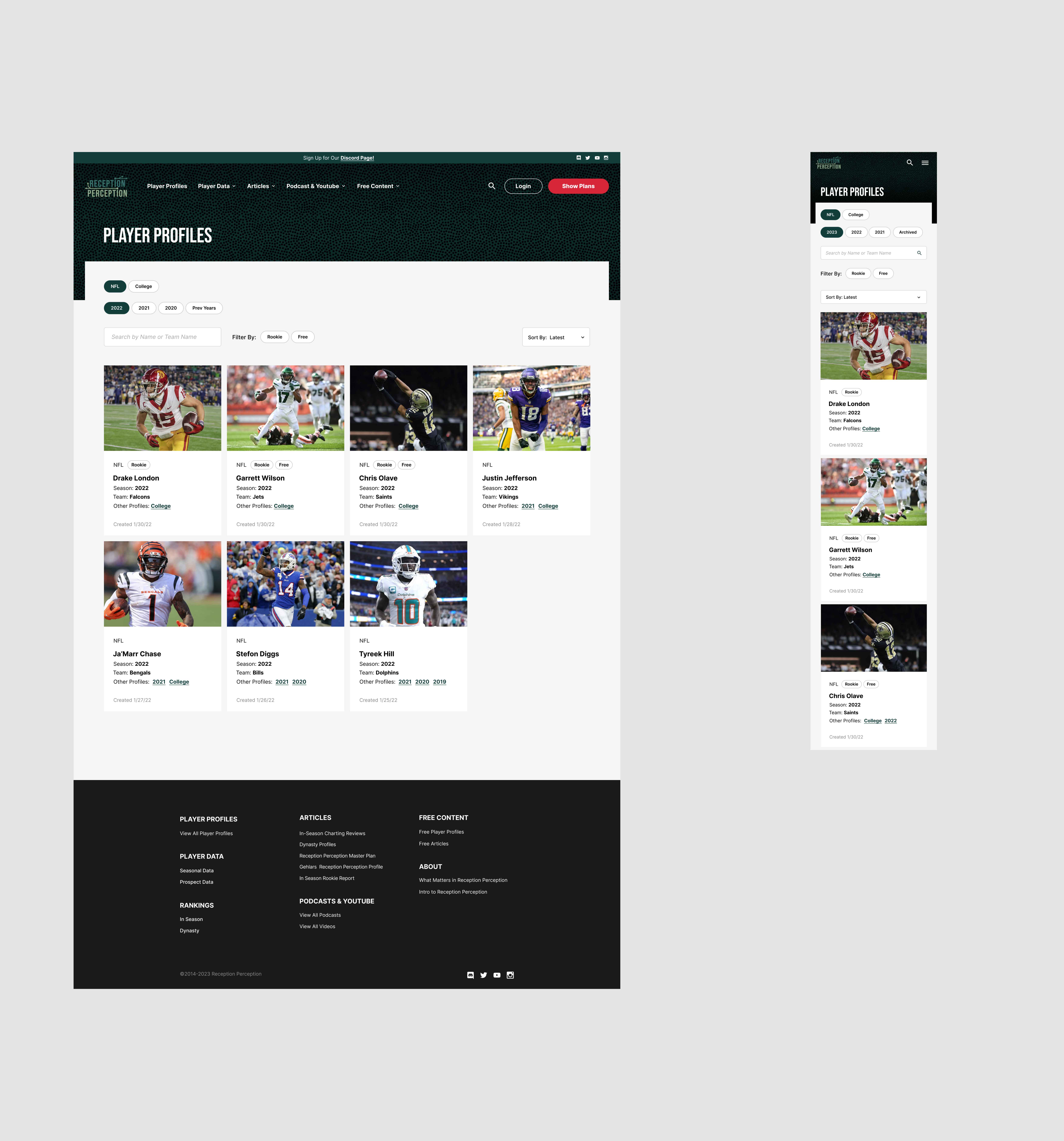 The goal of Reception Perception is to assess wide receivers and measure their route running abilities using exclusive charting data. The website required an updated user interface to enhance the mobile experience and simplify navigation for users.